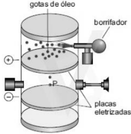 A medição da carga elementar foi realizada através de uma aparelhagem (dispositivo de Millikan) que consiste em borrifar minúsculas gotas de óleo para dentro de uma câmara (ver figura). Algumas se carregam eletricamente no processo. Considere uma gota de óleo com raio de 1,5 µm e massa específica de 0,8 g/cm³ atravessando um pequeno orifício na placa catódica. Esta fica suspensa entre as placas eletrizadas por ação de um campo elétrico de 1,2x10⁵ N/C. Dada a situação, assinale V (verdadeiro) ou F (falso) para a alternativa. (Dados: g = 10 m/s² e K = 9x10⁹ Nm²/C²)