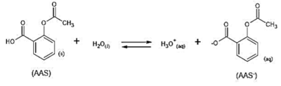 O medicamento Aspirina® contém o ácido acetilsalicílico (AAS) como princípio ativo, o qual inibe a atividade de enzimas que promovem o aparecimento de dor, febre e inflamação. O AAS é considerado um ácido fraco que, ao entrar em contato com uma solução aquosa, se ioniza, o que influencia significativamente o processo de absorção. A reação de ionização do AAS está representada de acordo com a equação de equilíbrio: