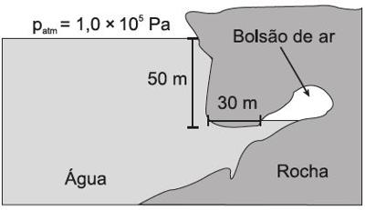 Um mergulhador fica preso ao explorar uma caverna no oceano. Dentro da caverna formou-se um bolsão de ar, como mostrado na figura, onde o mergulhador se abrigou.