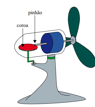 O mesmo eixo que faz girar as pás de um ventilador faz com que seu corpo oscile para lá e para cá, devido à conexão de uma engrenagem pequena de 4 mm de diâmetro (pinhão) à outra grande de 40 mm de diâmetro (coroa).