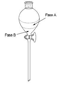 Uma mistura de NaCl dissolvido em água e azeite, após ser agitada, foi colocada em um funil de extração, como mostra a figura abaixo. Considerando a densidade do azeite à 25°C, 0,889 g mL⁻¹ e da solução aquosa de NaCl 1,0 g mL⁻¹, analise as afirmativas abaixo e marque a opção CORRETA: