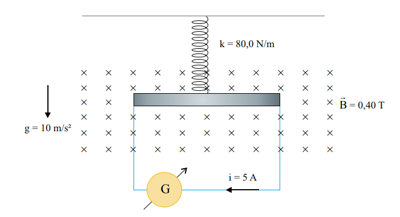 Uma mola de massa desprezível presa ao teto de uma sala, tem sua outra extremidade atada ao centro de uma barra metálica homogênea e na horizontal, com 50 cm de comprimento e 500 g de massa. A barra metálica, que pode movimentar-se num plano vertical, apresenta resistência ôhmica de 5 Ω e está ligada por fios condutores de massas desprezíveis a um gerador G de corrente contínua, de resistência ôhmica interna de 5 Ω, apoiado sobre uma mesa horizontal. O sistema barra-mola está em um plano perpendicular a um campo magnético B horizontal, cujas linhas de campo penetram nesse plano, conforme mostra a figura.