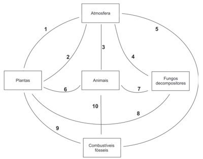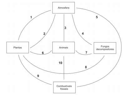 a) Complete a figura reproduzida na página de resposta, indicando com setas os sentidos das linhas numeradas, de modo a representar a transferência de carbono entre os integrantes do ciclo.