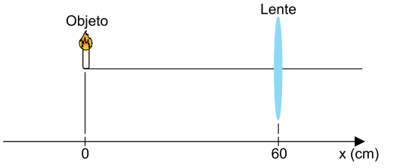 Sendo a distância entre o objeto e a lente igual a 60 cm, a posição da imagem conjugada pela lente no eixo x, representado na figura, é