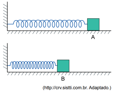 A figura mostra um objeto, de massa igual a 0,50 kg, sobre uma superfície horizontal, preso à extremidade de uma mola de constante elástica igual a 50 N/m, que tem a outra extremidade presa a uma parede. Inicialmente, o objeto é deslocado até a posição A, na qual a mola está distendida de 20 cm. Solto, o objeto passa a oscilar em torno do ponto B, que marca a posição na qual a mola não se encontra nem comprimida nem distendida.