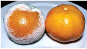A figura mostra uma tangerina repleta de colônias de fungos e outra, livre de colônias desenvolvidas.