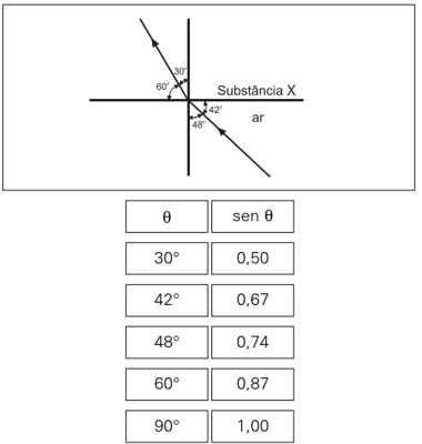 Usando a lei de Snell e a tabela dada, é possível concluir que o índice de refração da substância X em relação ao ar é igual a
