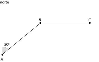 Renato saiu do ponto A e percorreu 10 km em linha reta, até o ponto B, numa trajetória que faz 50º com a direção norte. No ponto B, virou para o leste e percorreu mais 10.