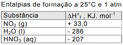Usando-se a equação (5) e os dados contidos na tabela, é correto afirmar que a variação de entalpia-padrão (∆H°) para a produção de 2 mols de HNO₃(aq) é: