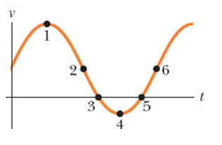 A figura mostra a velocidade de uma partícula em função do tempo, que se move ao longo de um eixo. O ponto 1 é o ponto mais alto da curva; o ponto 4 é o ponto mais baixo; os pontos 2 e 6 estão na mesma altura. Sobre o movimento dessa partícula, julgue a afirmativa em V para (verdadeira) ou F para (falsa).