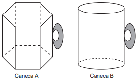 A caneca A tem formato de um prisma reto regular hexagonal de lado L = 4 cm, e a caneca B tem formato de um cilindro circular reto de diâmetro d = 6 cm. Sabe-se que ambas têm a mesma altura h = 10 cm, e que essa pessoa escolherá a caneca com maior capacidade.