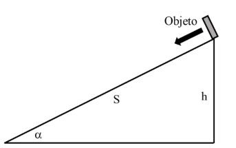 Um objeto de 2 kg e de tamanho desprezível está no topo de uma superfície plana e inclinada S de 6,25 m de comprimento e com altura h, inicialmente em repouso. Dado: sen α = 0,8 e aceleração da gravidade é 10 m/s².