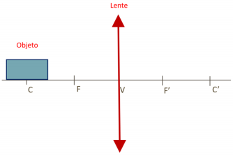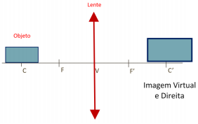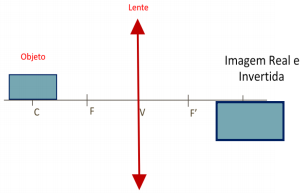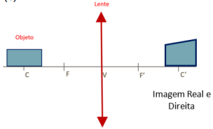 Um objeto real, retangular, de espessura desprezível, está posicionado em frente a uma lente esférica gaussiana conforme a figura abaixo.