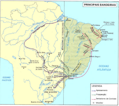A partir do século XVII, a exploração portuguesa no território brasileiro ultrapassou o litoral, avançando pelo interior, com o movimento das Bandeiras, representado no mapa a seguir.