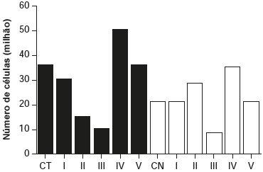 Em uma pesquisa estão sendo testados cinco quimioterápicos quanto à sua capacidade antitumoral. No entanto, para o tratamento de pacientes, sabe-se que é necessário verificar também o quanto cada composto agride células normais. Para o experimento, partiu-se de cultivos de células tumorais (colunas escuras na figura) e células normais (colunas claras) com o mesmo número de células iniciais. Dois grupos-controle não receberam quimioterápicos: controle de células tumorais (CT) e de células normais (CN). As colunas I, II, III, IV e V correspondem aos grupos tratados com os cinco compostos. O número de células viáveis após os tratamentos está representado pelas colunas.