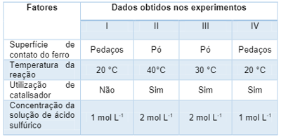 Em uma pesquisa, foram realizados quatro experimentos (I ao IV) para estudar os fatores que influenciam na velocidade de uma reação química envolvendo o ferro metálico em solução de ácido sulfúrico, conforme a representação da equação da reação química a seguir.