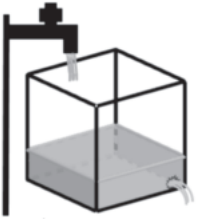 Uma pessoa pretende encher um recipiente cúbico com água. O recipiente, que já tem inicialmente um volume de água igual a V₀ litros em seu interior, é posicionado debaixo de uma torneira com vazão de 4 litros por minuto. No instante em que a torneira é aberta, uma pequena abertura na parte inferior do recipiente também é aberta, liberando água numa vazão de 3 litros por minuto. A figura representa a situação descrita logo após a torneira ter sido aberta.