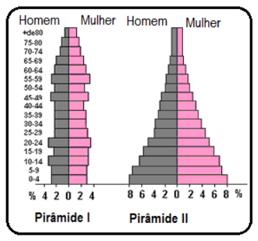 As pirâmides etárias são representações gráficas da população classificada por sexo e idade. No eixo vertical (y) estão indicadas as diversas faixas etárias, enquanto que no eixo horizontal (x) está indicada a quantidade de população existente num país ou região. Observe as duas pirâmides etárias a seguir,