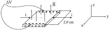 Na figura, uma placa quadrada de lado L = 2,0 cm, de material condutor, é percorrida por uma corrente elétrica no sentido y crescente. Ao aplicarmos um campo magnético constante de módulo B = 0,80 T, os portadores de carga em movimento, que originam a corrente de intensidade i, são deslocados provocando um acúmulo de cargas positivas na borda de trás e negativas na da frente, até que a diferença de potencial entre essas bordas se estabilize com valor ΔV = 4,0·10⁻⁷ V, o que resulta em um campo elétrico uniforme na direção x, decorrente dessa separação de cargas, que compensa o efeito defletor do campo magnético. Esse fenômeno é conhecido como efeito Hall.