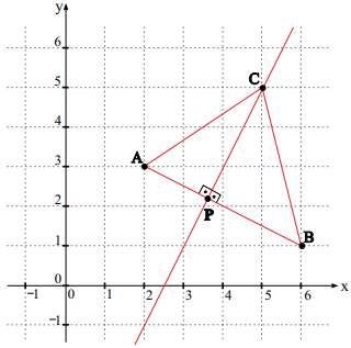 No plano cartesiano ortogonal, o triângulo de vértices A(2, 3), B(6,1) e C(5, 5) foi intersectado no ponto P por uma reta que passa por C e é perpendicular a AB, conforme indica a figura.