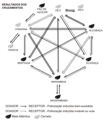 O processo de formação de novas espécies é lento e repleto de nuances e estágios intermediários, havendo uma diminuição da viabilidade entre cruzamentos. Assim, plantas originalmente de uma mesma espécie que não cruzam mais entre si podem ser consideradas como uma espécie se diferenciando. Um pesquisador realizou cruzamentos entre nove populações - denominadas de acordo com a localização onde são encontradas - de uma espécie de orquídea (Epidendrum denticulatum). No diagrama estão os resultados dos cruzamentos entre as populações.Considere que o doador fornece o pólen para o receptor.