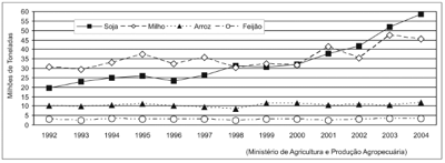 A produção agrícola brasileira evoluiu, na última década, de forma diferenciada. No caso da cultura de grãos, por exemplo, verifica-se nos últimos anos um crescimento significativo da produção da soja e do milho, como mostra o gráfico.