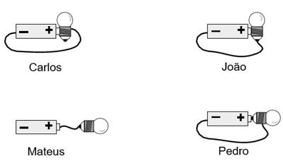Um professor pediu a seus alunos que ligassem uma lâmpada a uma pilha com um pedaço de fio de cobre.