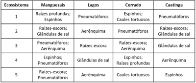O quadro apresenta, na linha principal, diferentes ecossistemas e, nas linhas numeradas de 1 a 5, estruturas adaptativas presentes em diferentes espécies vegetais.