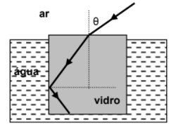.a) Qual a condição para os índices de refração (água e vidro) para que possa haver reflexão interna do feixe dentro bloco de vidro?