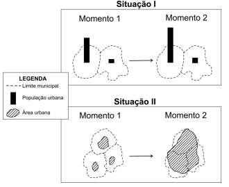 A recente urbanização brasileira tem características parcialmente representadas nas situações I e II dos esquemas acima. Considerando essas situações, é correto afirmar que, entre outros processos,