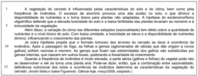 [...] a combinação entre sazonalidade, deficiência nutricional dos solos e ocorrência de incêndios determina as características da vegetação do cerrado. (linhas 14 a 16)