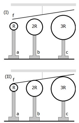 A figura abaixo representa 3 esferas, a, b e c, com raios R, 2R e 3R, perfeitamente condutoras e eletricamente carregadas, e um fio f, também perfeitamente condutor e neutro, suspenso por uma corda isolante, em dois momentos distintos (I) e (II). As esferas estão em suportes isolantes e separadas por grandes distâncias
