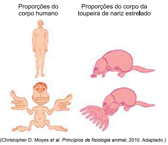 A figura representa um corpo humano e uma toupeira de nariz estrelado em seu formato normal e com representação proporcional à área do córtex cerebral destinada ao processamento de informações