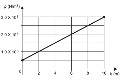 A figura representa o gráfico p x h (pressão x profundidade) para um líquido contido em um reservatório aberto. Uma esfera, cujo volume é de 200,0cm³, feita de um material cuja densidade é de 0,8g/cm³, é totalmente mergulhada no reservatório e abandonada a seguir.