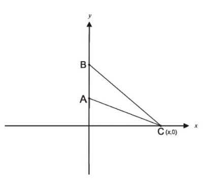 A figura representa no plano cartesiano um triângulo ABC, com coordenadas A (0,5), B (0,10) e C (x,0), em que x é um número real positivo.