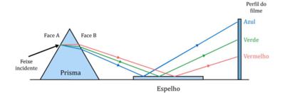 A figura representa um prisma óptico, constituído de um material transparente. Um feixe luminoso, composto por luzes vermelha, azul e verde, incide na face A, emerge na face B e, após ser refletido por um espelho, incide num filme para fotografia colorida, revelando três pontos.