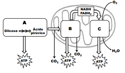 A figura abaixo representa o processo de geração de energia nas células eucarióticas, que compreende as etapas A, B e C. As etapas B e C ocorrem dentro da mitocôndria, enquanto a etapa A ocorre no citosol (hialoplasma).