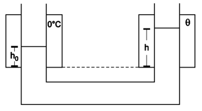 A figura representa um tubo em forma de U, contendo um líquido. Os ramos do tubo estão envolvidos por camisas de refrigeração que contêm gelo em fusão a 0ºC e a água à temperatura