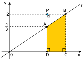 A reta r passa pela origem (0, 0) do sistema cartesiano de eixos ortogonais e pelos pontos A e B, de ordenadas 4/3 e 2, respectivamente. P é um ponto de coordenadas (xᴘ, 2) e também é colinear aos pontos A e D, como mostra a figura.