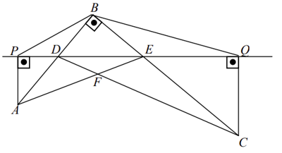 é reto; a reta r corta os segmentos AB e BC em D e E, respectivamente; as retas CD e AE se cortam em F; P e Q são as projeções ortogonais de A e C sobre a reta r, respectivamente.