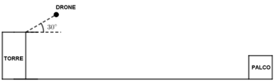 Um show é realizado em um terreno plano onde estão localizados um palco e uma torre de 5 metros de altura. Durante a realização do show um drone é acionado no ponto mais alto da torre aproximando-se do palco. Ele segue uma trajetória retilínea ascendente e que forma ângulo de 30° com o solo. Após percorrer 30√3 metros, o drone atinge o ponto mais alto deste trajeto, exatamente acima do ponto médio entre a base da torre e o palco. A figura abaixo esquematiza a posição do drone após o início do movimento.