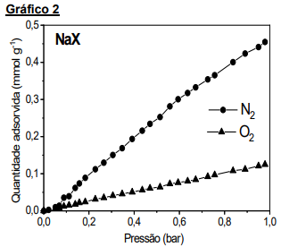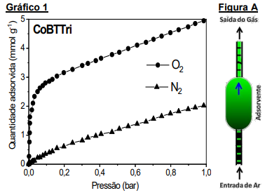 O sistema PSA (Pressure Swing Adsorption) é uma alternativa à produção de oxigênio para hospitais ou indústrias distantes de fornecedores. Esse sistema é também uma opção para os casos em que a produção por destilação criogênica não supre a demanda. O funcionamento do PSA se baseia na adsorção seletiva do oxigênio ou do nitrogênio. O ar pressurizado é forçado a passar por colunas contendo substâncias sólidas. Tais substâncias adsorvem seletivamente ou o oxigênio ou o nitrogênio. Quando o sólido fica saturado, promove-se uma despressurização do sistema e então o gás se dessorve do sólido. Dessa forma, os dois principais gases do ar são separados um do outro. A figura A esquematiza o sistema de funcionamento do PSA e os gráficos 1 e 2 representam isotermas de adsorção (estudo do equilíbrio a uma temperatura constante) de N₂ e O₂ para dois adsorventes distintos. O gráfico 1 diz respeito a um complexo do metal cobalto denominado CoBTTri, enquanto o gráfico 2 diz respeito a um zeólito representado pela fórmula NaX.