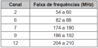 No sistema de transmissão analógico de televisão no Brasil, cada canal ocupa uma faixa de 6 megahertz (MHz). O quadro mostra as faixas de frequências utilizadas por alguns canais.