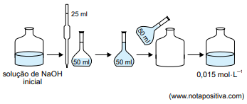 Uma solução de NaOH, de massa molar = 40 g⋅mol⁻¹, foi preparada a partir do procedimento ilustrado a seguir: