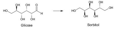 O sorbitol é um poliálcool muito utilizado como adoçante de bebidas. Essa substância pode ser encontrada em diversas frutas e também é produzida no corpo humano. A produção dessa substância ocorre a partir da conversão da glicose em sorbitol com a presença de uma enzima específica para esse processo. A reação está representada abaixo: