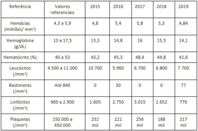 A tabela apresenta parte do resultado de um hemograma (exame popularmente conhecido como “exame de sangue”)