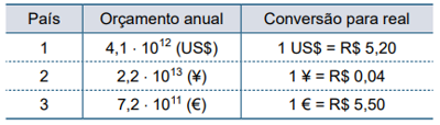 A tabela indica o orçamento anual destinado à saúde de três países e as conversões de suas respectivas moedas em reais.
