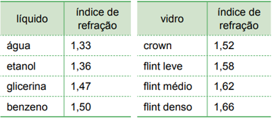 Considere que um raio de luz amarela propaga-se inicialmente em um dos líquidos indicados na tabela e passa a se propagar em um dos vidros também indicados na tabela.