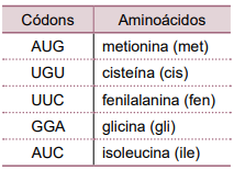 A tabela relaciona alguns códons a seus respectivos aminoácidos.