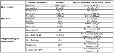 A tabela a seguir mostra o resultado de algumas variáveis de um exame de sangue realizado por uma pessoa adulta. Os dados dos exames são relacionados à série vermelha, à série branca e a alguns patógenos.